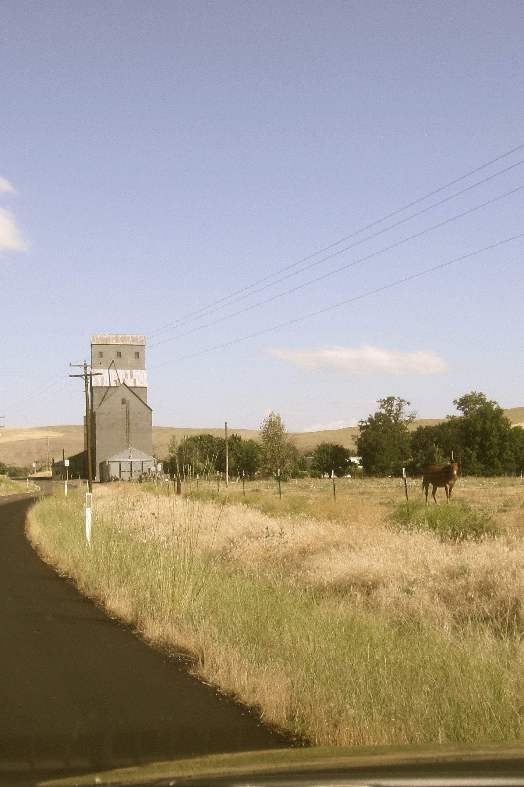 Miles down the highway, I turn off I-90 at Washtucna. Within seconds I’m out of “town” and driving alone on a south-easterly direction toward the lowering sun. I make out the shape of something huge that’s dwarfing a full-sized truck following it with lights flashing. It’s some kind of farm vehicle taking up my shoulder, my lane and over half of the oncoming lane. With the sun in my eyes, I look past to see if cars are coming and inch around on the oncoming shoulder. In the distance I see the grain elevator where I’m supposed to turn left. The lug-nuts on this piece of farm equipment are at eye level. I pass three of these. RV’s are the largest vehicle I’ve seen on the road. I wish my car had a helmet cam to capture this ride.
